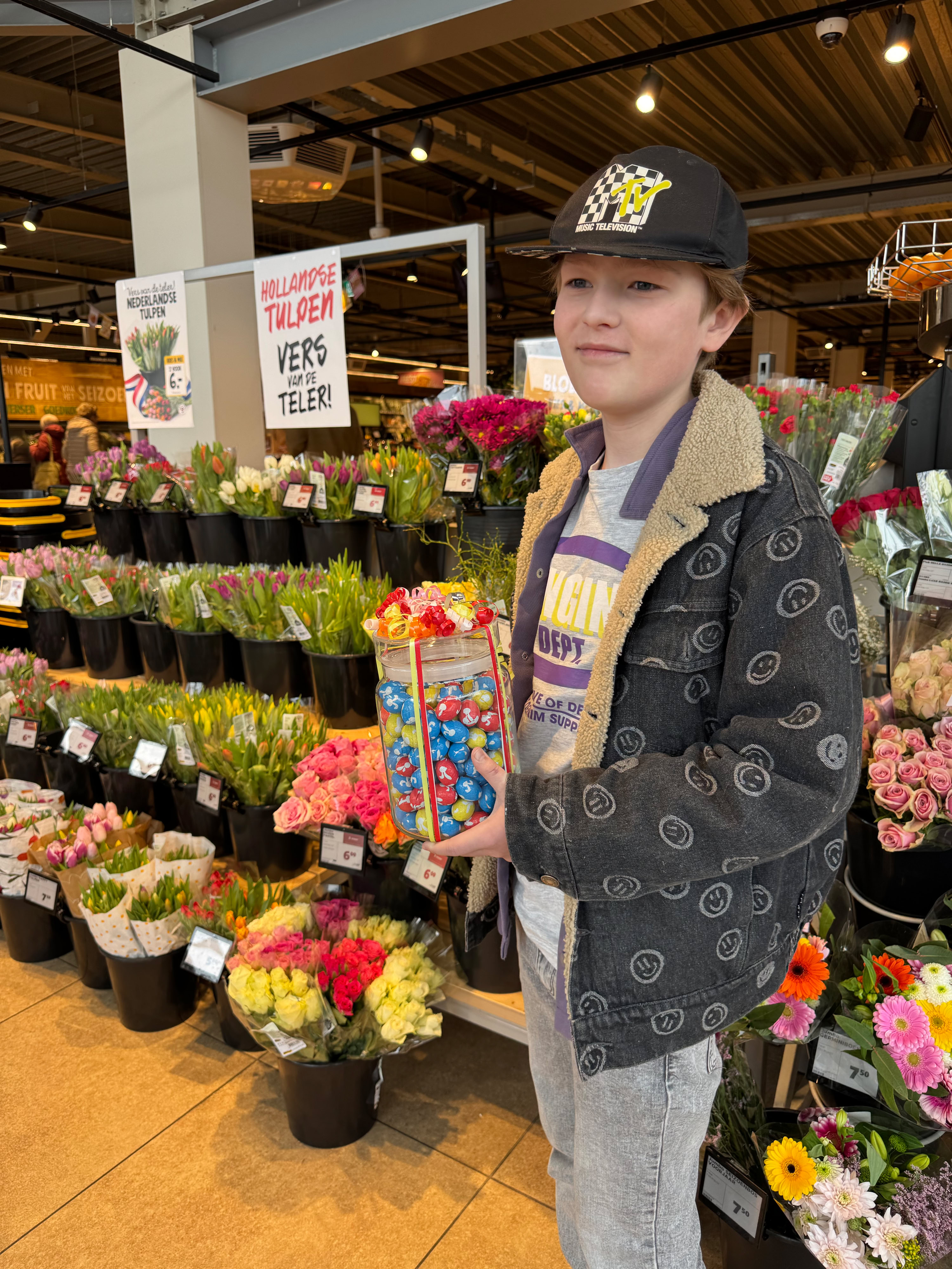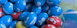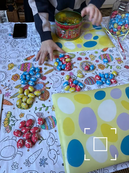 Nei’t de boadskippen betelle binne, triuwe wy de ôfladen winkelkarre nei de útgong. Tsjinoer de kassa’s stie op de ynpakplanke in pot mei peaske-aikes. Jo meie riede hoefolle as der yn de pot sitte. It tal op in briefke skriuwe en yn it njonkensteande bakje smite. Jo kinne de hiele pot mei sûkelade-aikes winne.
