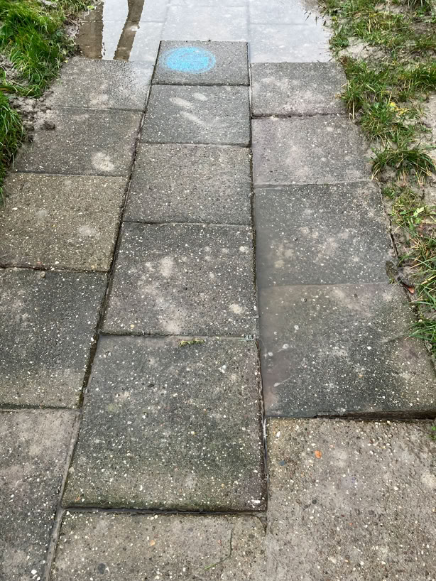 De tegels hiene se der sa mar wer wat ynklapt. Want doe’t ik der oer hinne rûn, sakken se fuort nei ûnderen en ûntstie der in nuvere hobbeldebobbel yn ús paadsje. Dat ek noch. Mar de put wie leech! De besite koe mar komme.