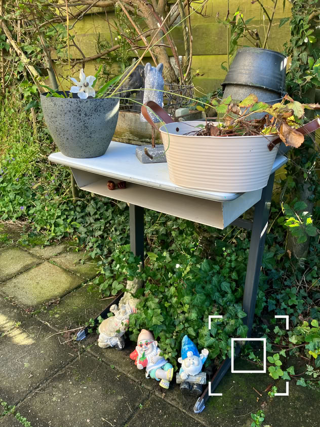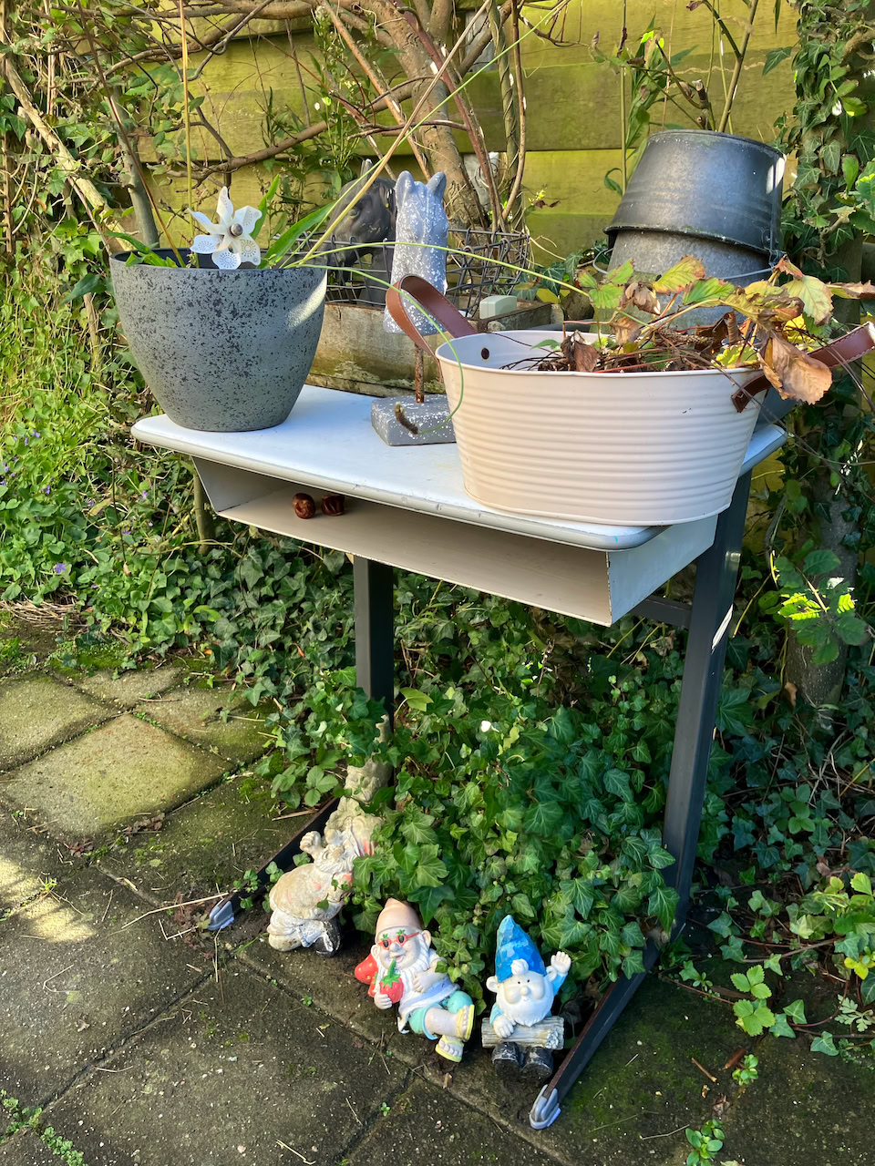 Om dit perfekte plaatsje hielendal kompleet te meitsjen, wiksele ik de rêchleuning en de sitting fan it stikkene stuoltsje om mei de nije stoel út Easterlittens. Dy wiene krekt wat moaier. Ek wiksele ik de poatdoppen om, want dy fan ús wiene wat grutter en steviger. It stuoltsje funksjonearret wer as foarhinne, it ferskil is amper te sjen. It bypassende tafeltsje hiene wy net nedich, mar krigen wy der fergees by. Dat stiet no achterhûs, mei blommeguod en oare túndekoraasjes der op. Ach, sa kriget it dochs wer in funksje.