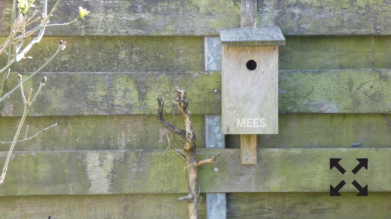 Doe hipte ien fan harren nei it nêstkastke dat by ús oan it sket hinget. It blaukopke beseach it fan alle kanten! Aha, dy twa wiene op syk nei in wenning!