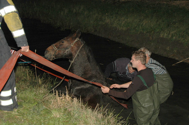 Ferhúzje! (2) Dan ha jo in moai plakje fûn, hynders tefreden en de baas tefreden. Mar it moat wol wenne! Sa'n sleat bygelyks, dat binne wy net wend yn 'e wâlden. Boppedat smakket dat farske reid ek hearlik. En dan steane jo der samar middenyn! Och, kin ik moai fierder gêrzje fan dat reid... Mar wol sawat de hiele Lytse Jouwer oerstjoer! Want út sa'n steile sleat komme jo net samar. En dan is de baas ek noch net iens te berikken, want dy wie op famyljebesite yn Warkum. Fia, fia koe it mobilenûmer achterhelle wurde. Mar dan binne jo ek net samar even wer thús. Lokkich kinne doarpsgenoaten sels ek inisjatyf nimme, dat it duorre net lang en dêr wie de Ternaarder brânwacht (en de fotograaf fan Wâldnet...) en mei in protte help fan de omstanders kaam Menta wer op it droege, aardich ûnder de drek, mar alhiel net oerstjoer. It oare hynder, Hidowijn har folle suster, seach it allegearre oan en doe't it har te drok waard, toffele dy nei de stâl. Se sil wol tinke, ik ha har noch sa warskôge, mar ja, as jo net lústerje wolle, dan moatte jo sels ek mar foar de gefolgen ynstean. Wilma soe de mannen fan de brânwacht in doaze mei oranjekoeke bringe, se hie it al yn 'e hûs helle. Mar doe't se skille, sei de brânmaster dat se leaver in slokje hienen. Dat meikoarten stiet der in kratsje 'fris'drank by de kazerne yn Ternaard. Hulde foar alle helpferlieners, doarpsgenoaten en Jochem Wiersma dy't graach syn foto's nei ús tastjoerde as herinnering oan dit spannende aventoer. En Menta? Dy dartelt al wer fleurich troch it lân, op syk nei in nije útdaging. De Lytse Jouwer kin him mar klear meitsje... Klik