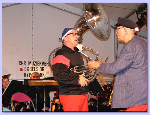 Dêr waarden wy suver wat kjel fan, in grutte foto fan ús optreden yn Ryptsjerk. Libbensgrut op de foarside fan de Actief. Eins fûnen we dit net sa moai (knypeach). Want dy sêne hâlde wy it leafst wat geheim en wy sette dan ek noait foto's fan dizze sêne op ús websides as soksawat. En no samar hús-oan-hús yn Tytsjerksteradiel en omkriten. No ja, it is net oars... Wy ha in prachtige jûn hân yn Ryptsjerk. It muzykkorps Excelsior bestie 100 jier en op dizze jubileumdei hienen se ús útnoege om mei it korps it gedielte nei it skoft wat op te fleurjen. Dat slagge goed en de sfear siet der goed yn. Mar dat kaam fansels ek omdat it korps foar it skoft in prachtich konsert jûn hie.